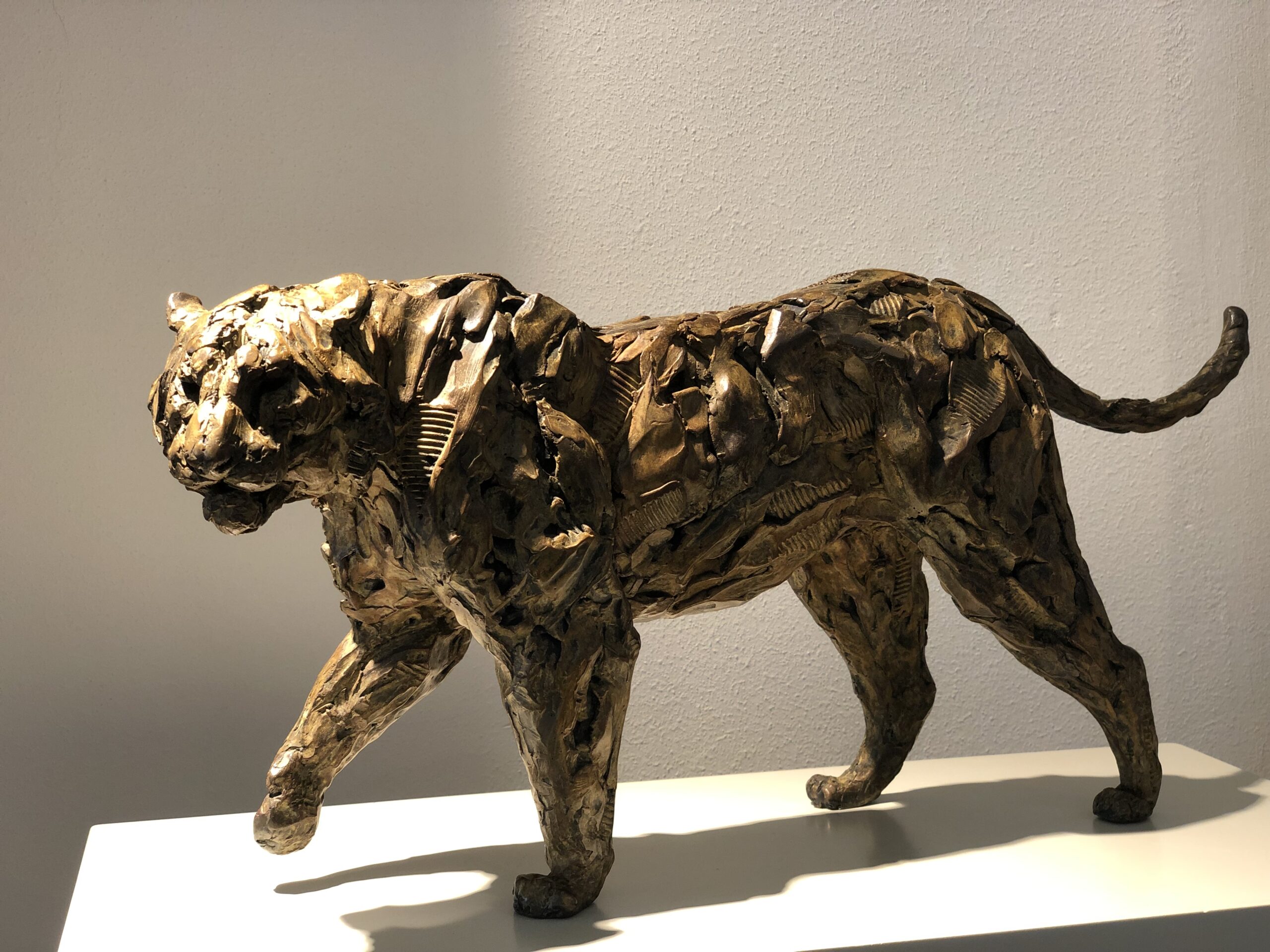 Les traces d’outils sont laissées apparentes intentionnellement. Grâce à la patine, l’accent est mis sur les creux et les aspérités qui sont le reflet d’un moment important, une partie de son histoire. Il s’agit de ne surtout pas lisser la surface mais au contraire de la sublimer tout en insufflant une âme à l’œuvre. Ces marques sont inspirées du Kintsugi, un art ancestral Japonais qui invite à réparer un objet cassé en soulignant ses cicatrices de poudre d’or, au lieu de les cacher. Consolidé, embelli, il porte alors fièrement ses blessures, et devient paradoxalement d’autant plus précieux qu’il a été brisé.