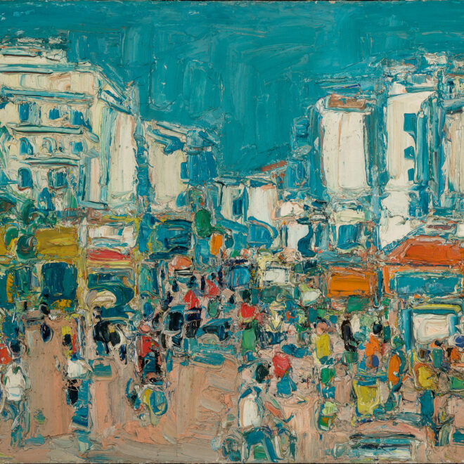 Sanzism” or the “New figuration of the Ecole de Lyon” favors a light that is not just natural, but that gushes from the canvas itself. André Cottavoz adheres to its principle while adding to it his personal touch. He submits the subject, whatever it is, to a perception of thickness obtained by superimposing layers, mixing, kneading them with a brush, a knife, or by hand. “Painting is almost sculpting,” he says. His canvases reflect his singular vision of places and of the South of France, which he particularly likes. He also explores other techniques such as engraving and lithography. His works have been acquired by many museums in France and abroad, notably in Japan. Since 1990, his work is on permanent exhibit at the four sites of the Estades Gallery, in Paris, Lyon, Toulon, and Baden-Baden (Germany).