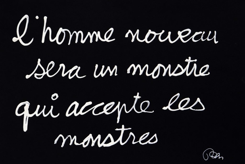 This way, he entered the universe of conceptual art, an art form that had not been developed yet. His white letters on a black background handwritten jokes and subjects such as ego, truth, or even ethnicity started to ring like real jingles.