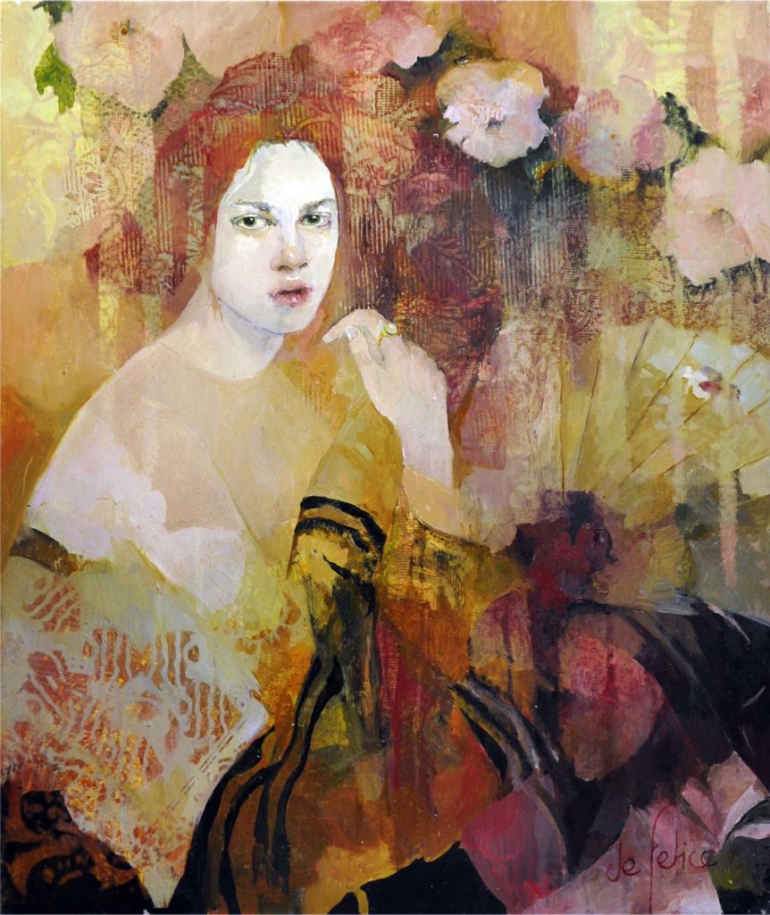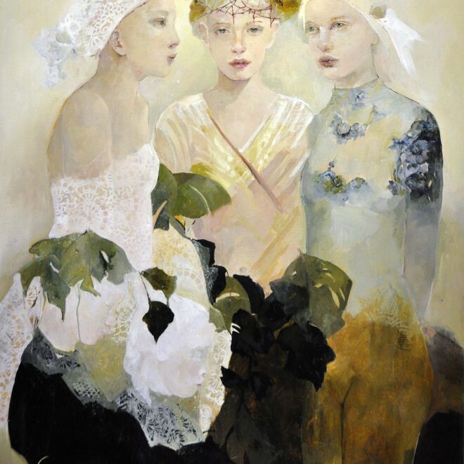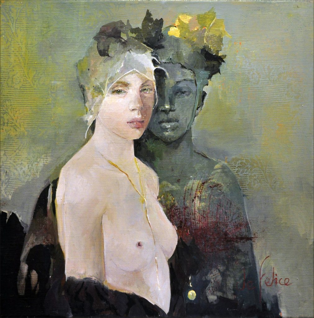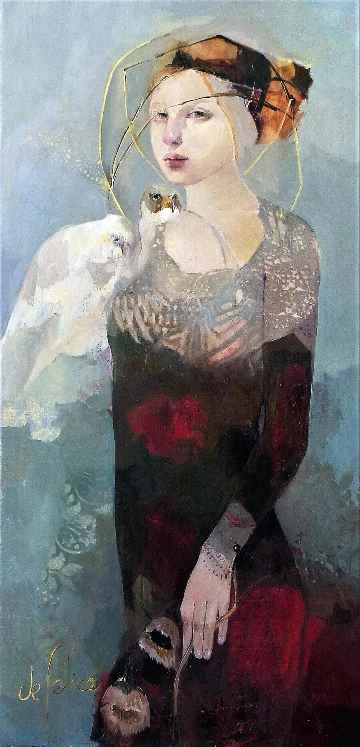 Starting from distinctly female subjects, we are starting to apprehend intimate echoes of the subconscious. Birds or other animals lose their gender and embody symbols found in mythology or stories molded in the collective unconscious. Defining a work’s central theme is a multi-dimensional challenge. Beauty feeds her universe, not just beauty for the eyes but also, and above all, beauty for the soul. The artist offers us a singular unique respite in today’s contrasting art environment.