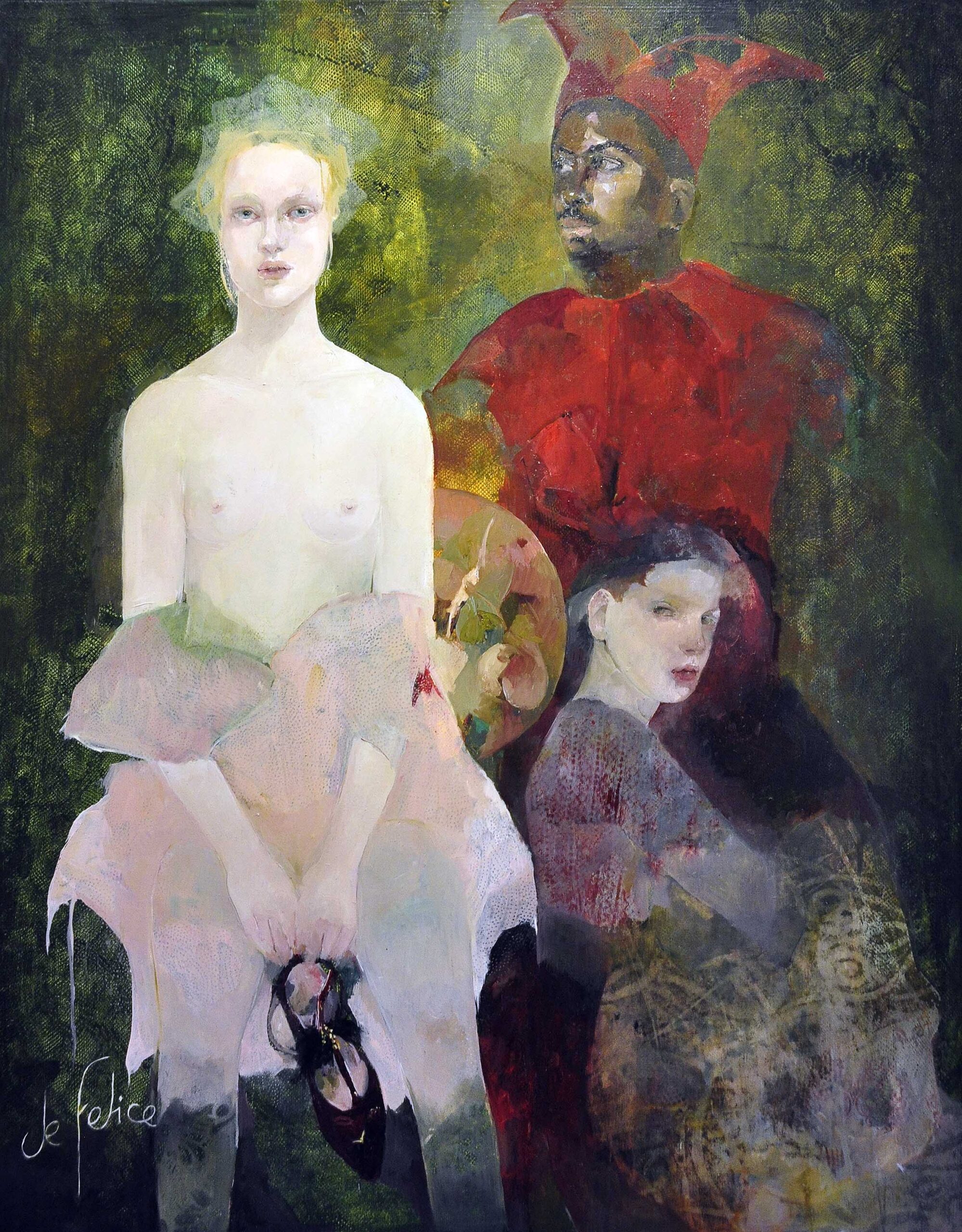 One could describe her work as a story on femininity, soft, and melancholic. Like in a hologram, we fall into a subliminal and poetic labyrinth. Ambiguities are played out in a complex world where she fights her demons. Nothing is perfectly serene in Françoise’s canvas. Hidden streaks of colors and drips reveal a break with the continuity of the dream or the aborted tale. A figure is followed by her double, a green woman poses and glare suspiciously or inquisitively at a group standing there, doing nothing, waiting, or meditating until they disappear as women to symbolize the androgynous nature of our being.