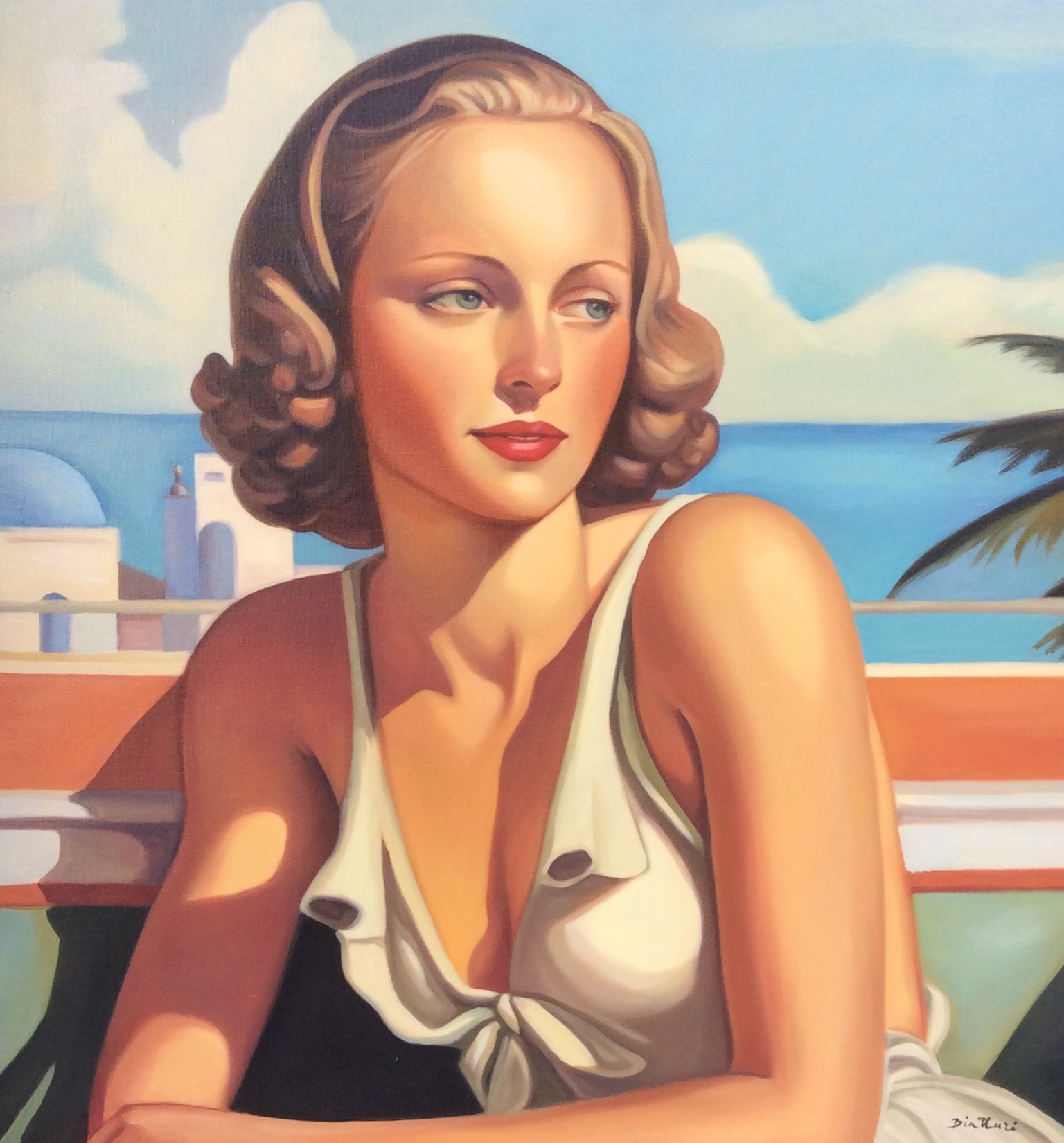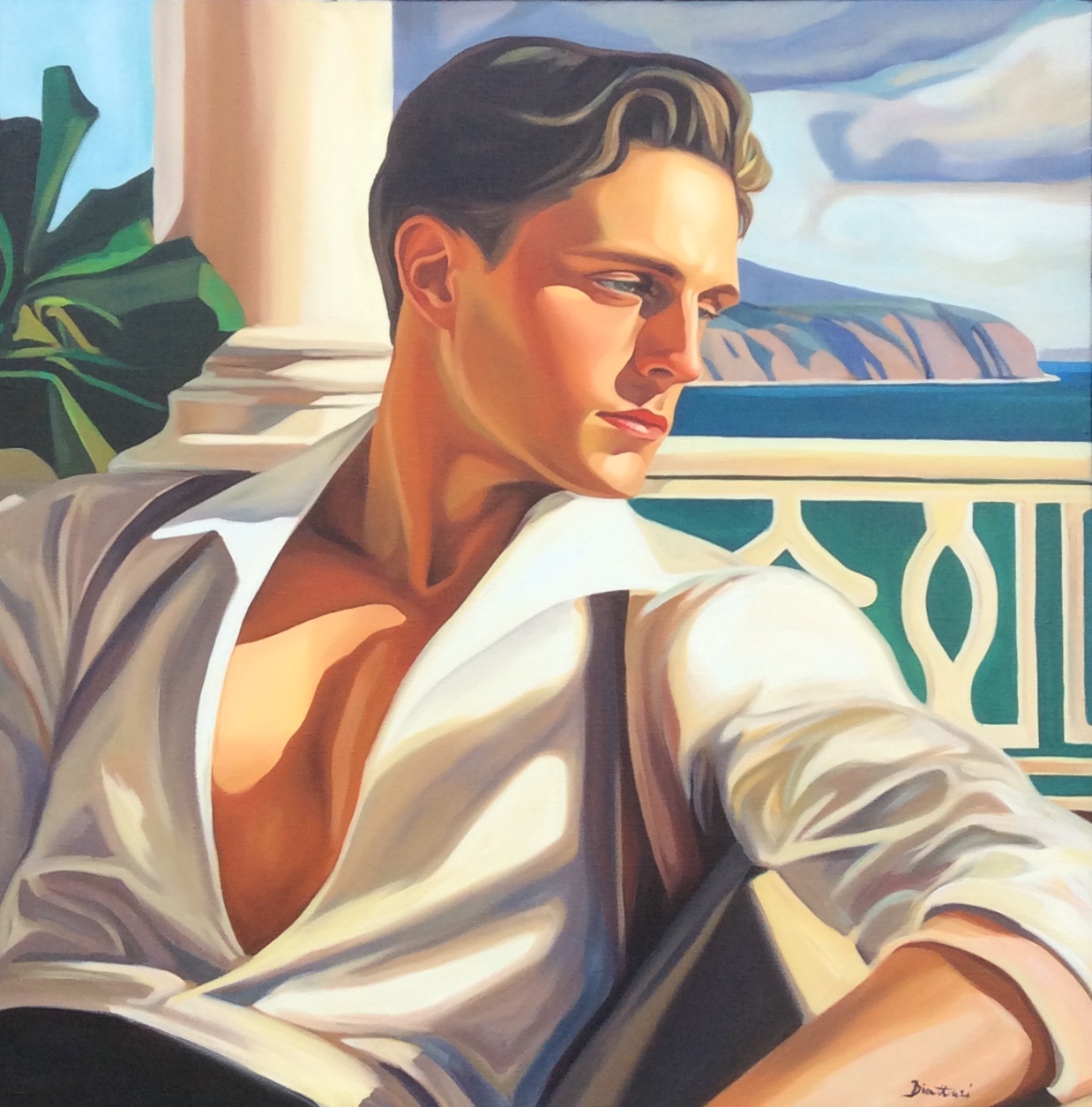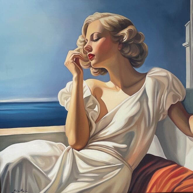 His oil paintings, which have women and sensuality as their subject, are inspired by Art Deco and Art Nouveau, but also by the compositions of the masters of the Italian Renaissance. His paintings inspire peace and tranquility, and invite the viewer to immerse themselves in the atmosphere of the glamorous and enchanting era of the “roaring twenties” on the Côte d’Azur.