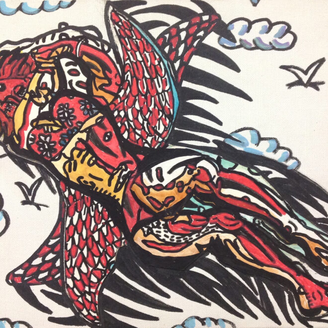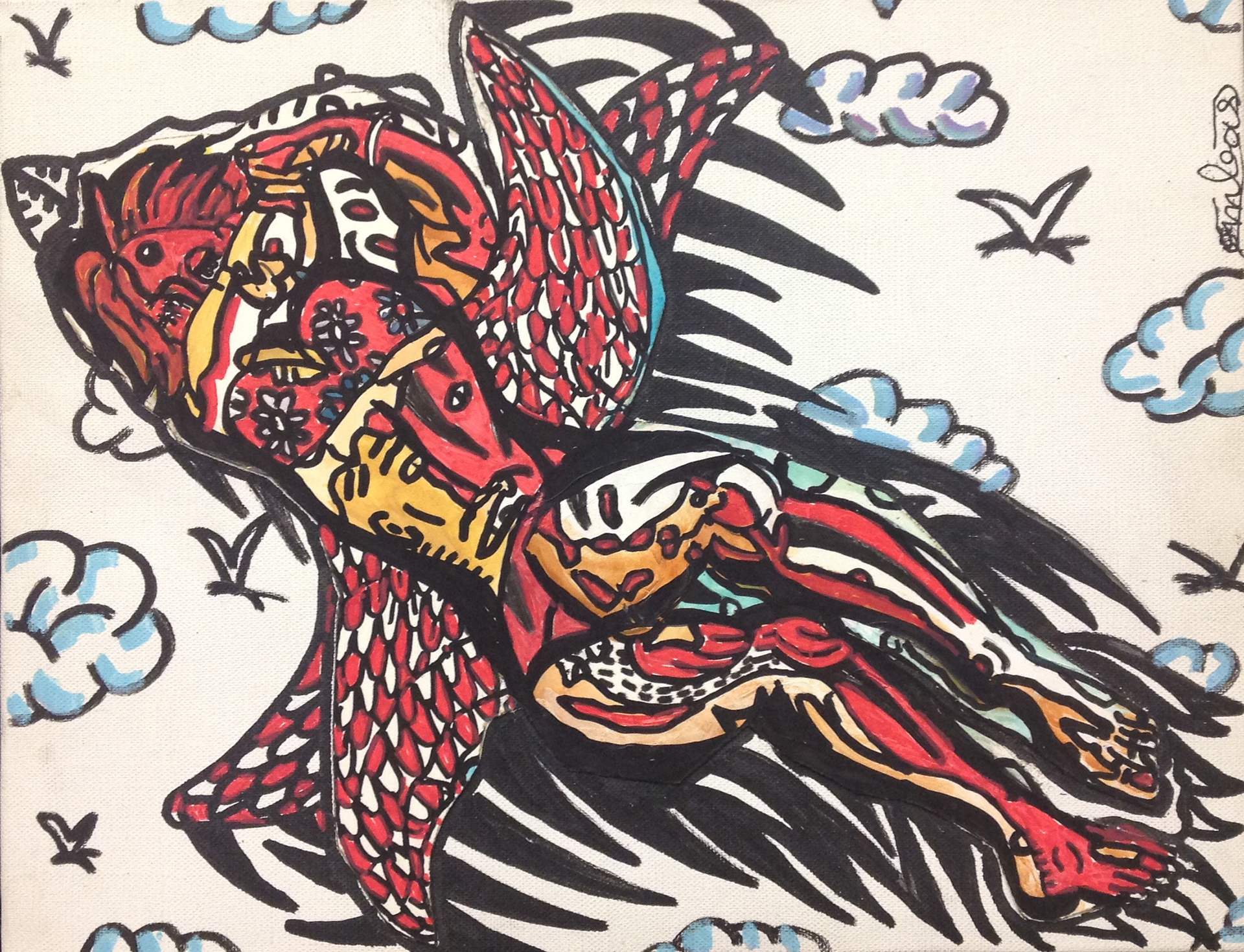 Robert Combas manipulates daily life images, mixing historical and mythological references. Following graffiti and comics style, he mixes raw lines and bold colors.