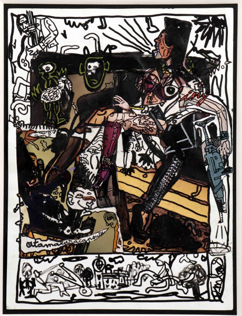 His source of inspiration is a popular culture accessible by all, such as graffiti, comic strips, street art, and rock music, which he loves. Combas is known for his extensive collection of vinyl records, and his knowledge of the Anglo-American culture of the sixties. In 1978, he founded a rock band, “Les Démodés”, which lasted barely a year. In 2012, with his friend and accomplice Lucas Mancione, he created another band “Les Sans Pattes”.