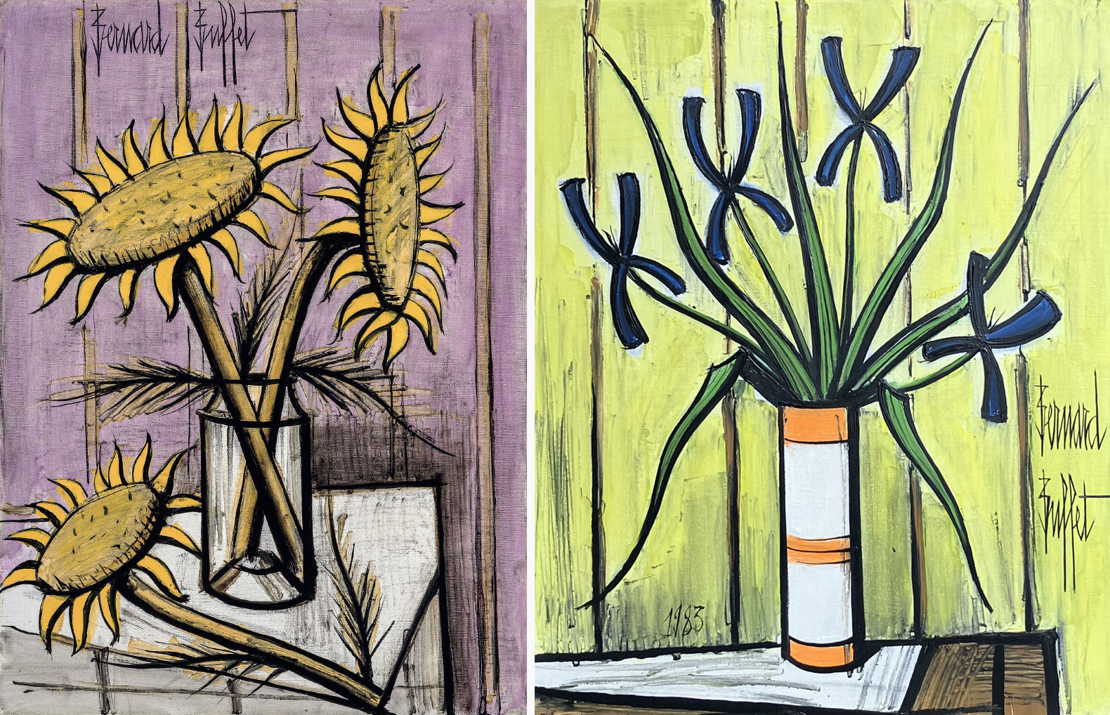 Ses bouquets de fleurs, loin de l’image attendue de la nature morte traditionnelle, révèlent une tension singulière et une variété de formes et de couleurs inattendues. Tiges rigides, fleurs à maturité ou corolles franchement épanouies, les bouquets de Bernard Buffet ne se ressemblent jamais les uns les autres et ne ressemblent à nul autre.