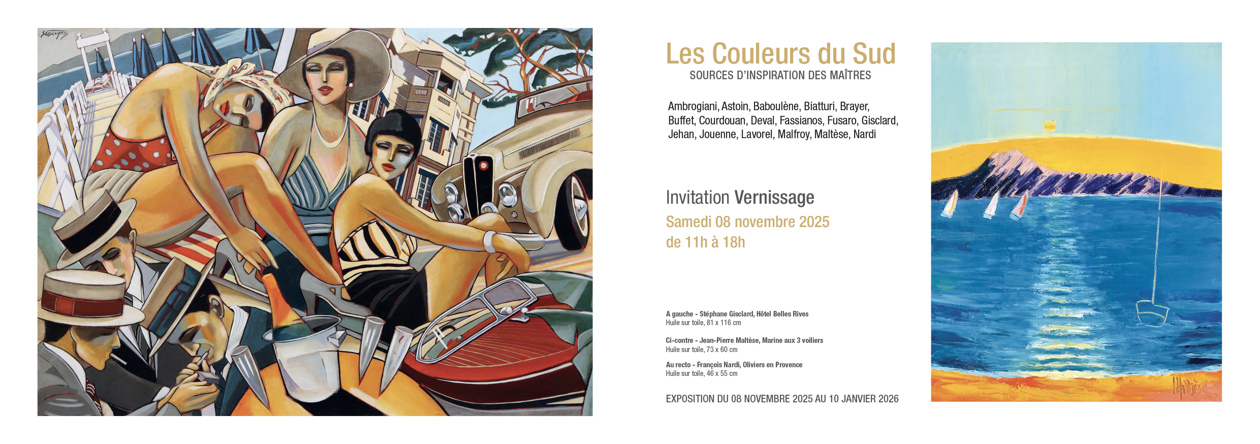 Nous avons le plaisir de vous convier au vernissage de l’exposition Les Couleurs du Sud – Sources d’inspiration des maîtres : une sélection de paysages et marines peints par des artistes majeurs qui ont célébré la lumière du Midi.